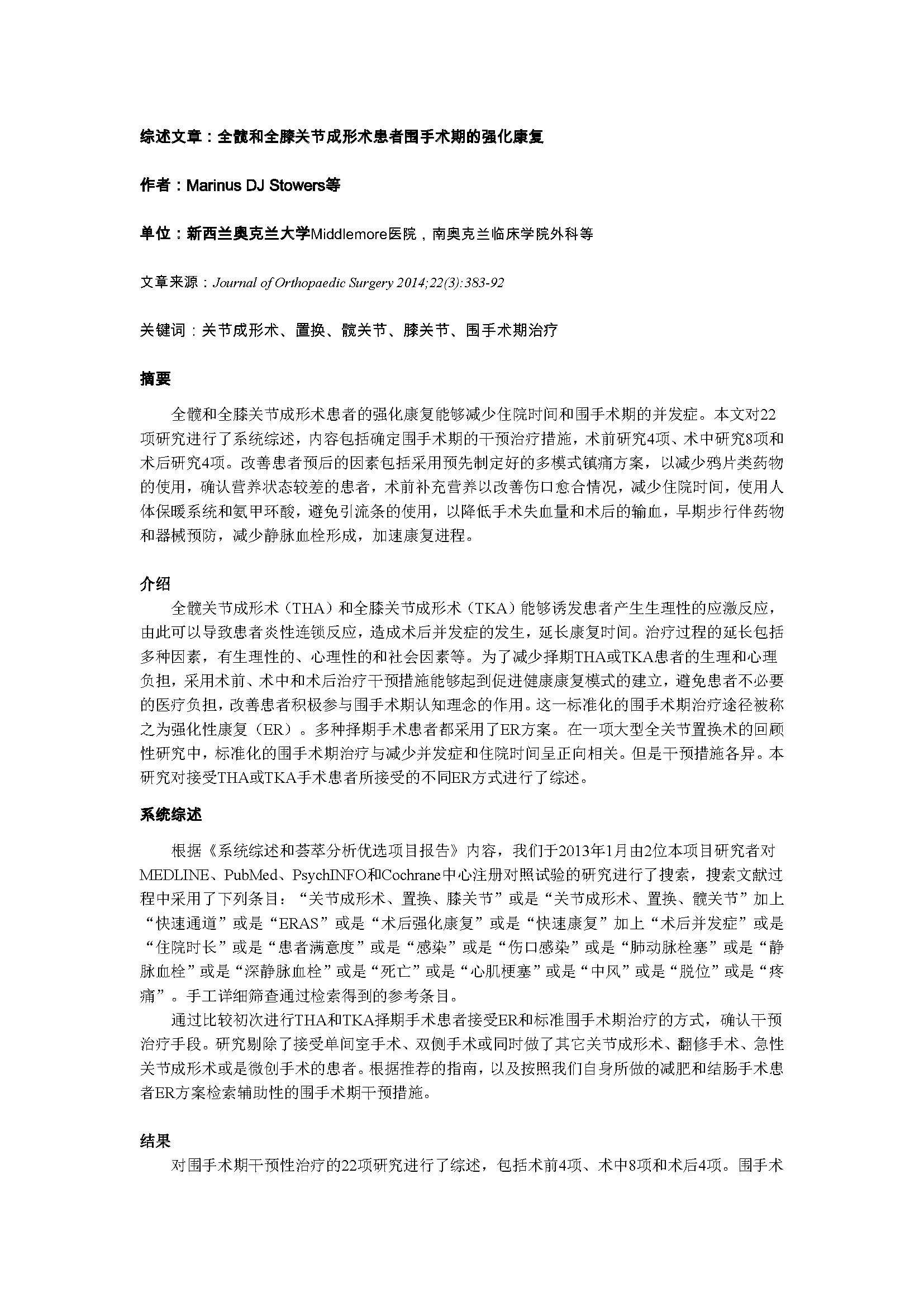 全髋和全膝关节成形术患者围手术期的强化康复(新西兰)