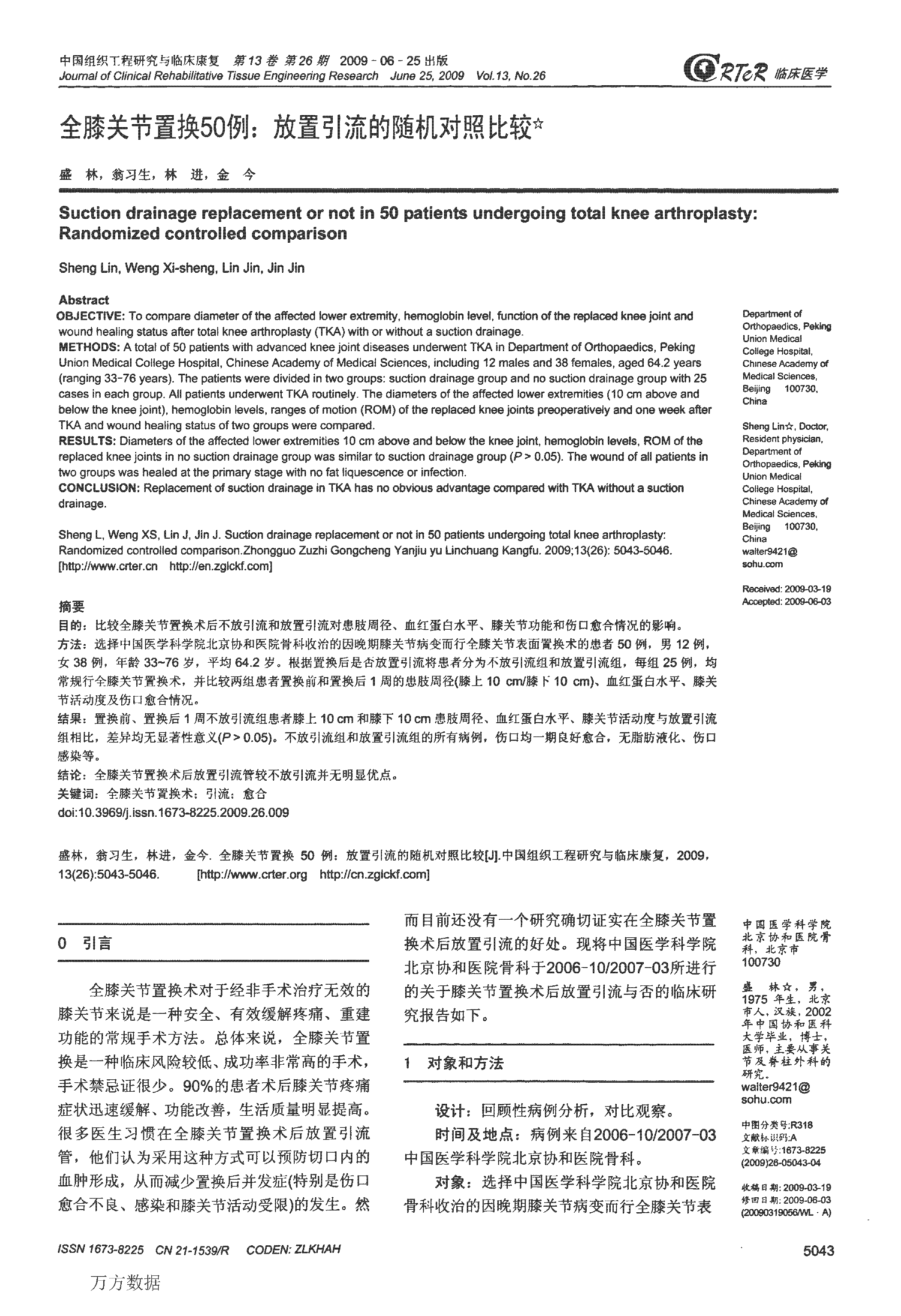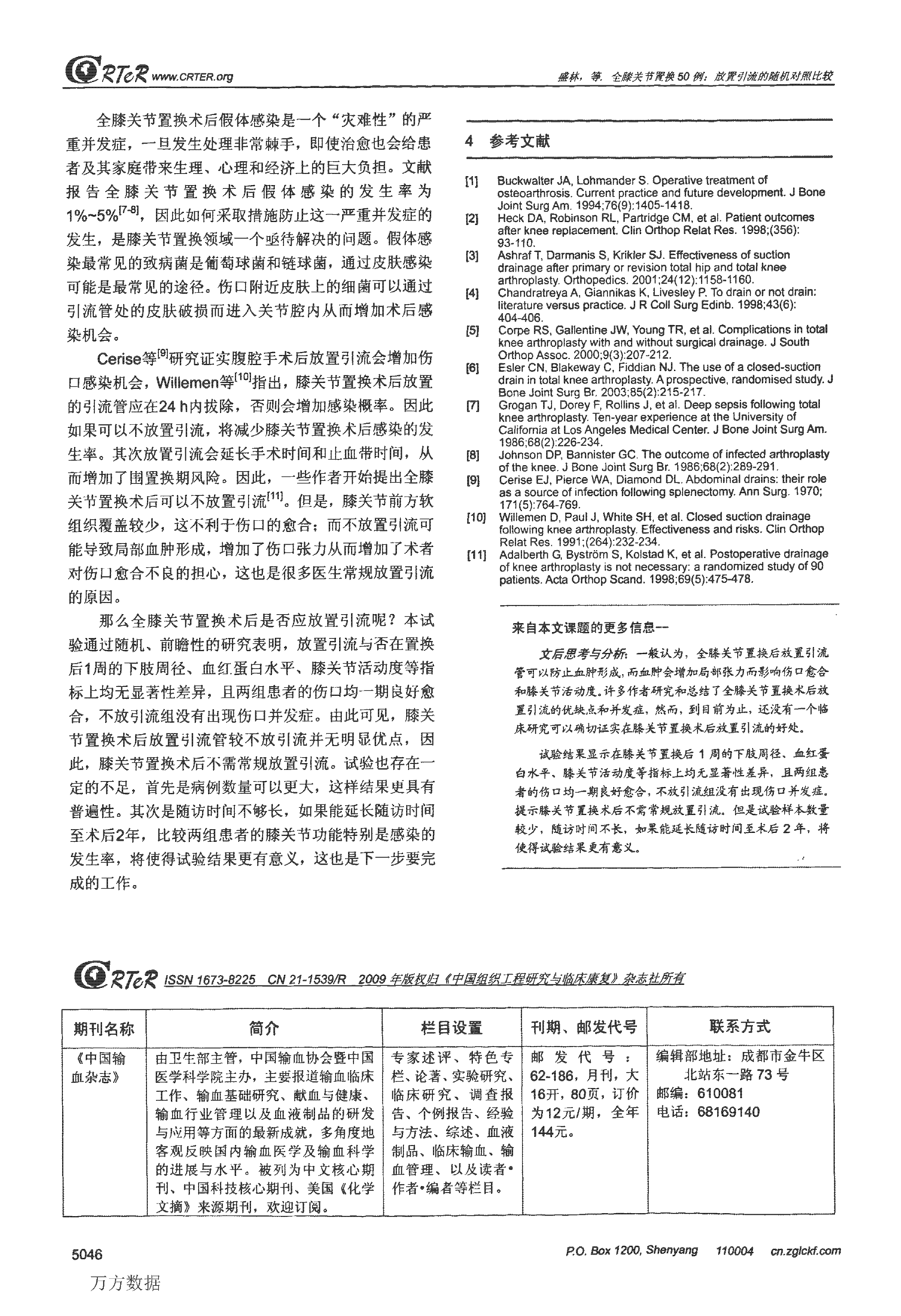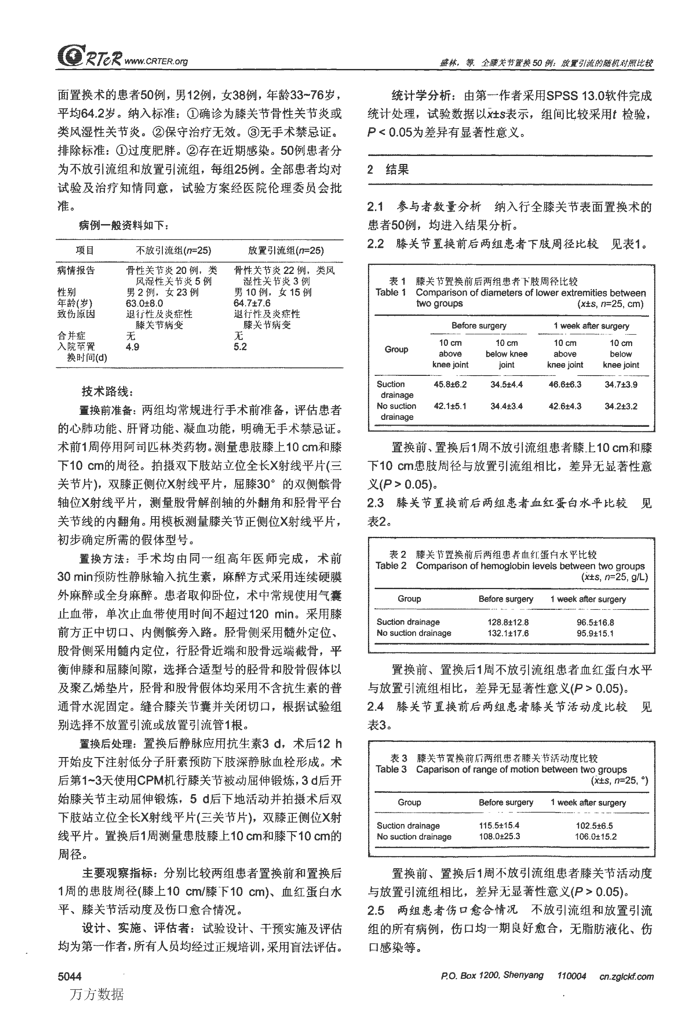 全系关节置换50例:放置引流的随机对照比较