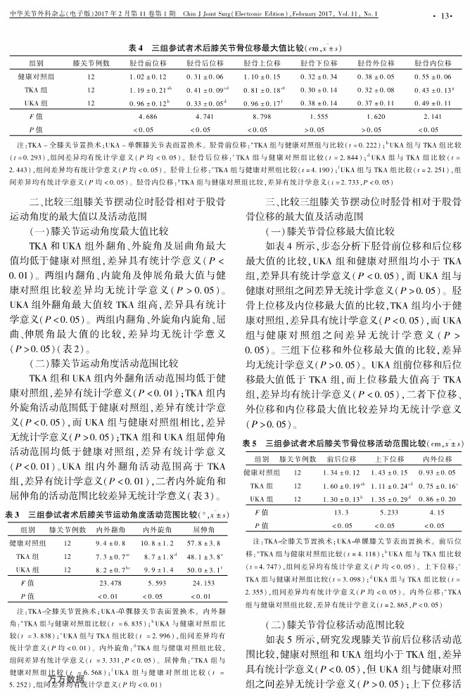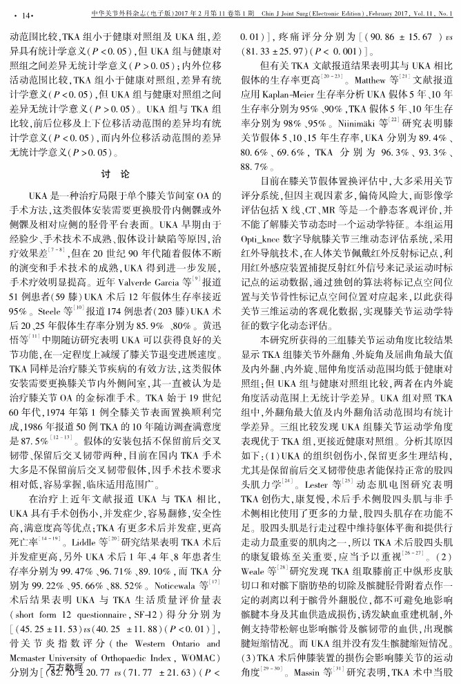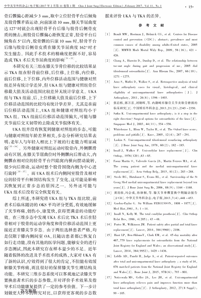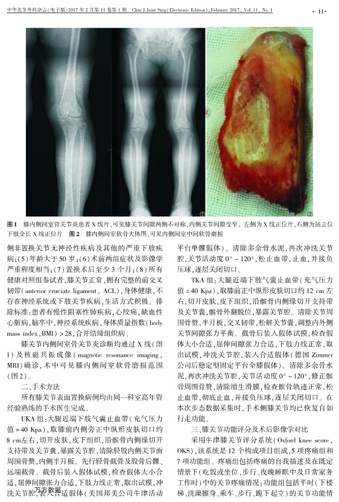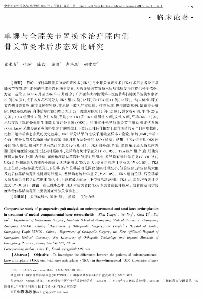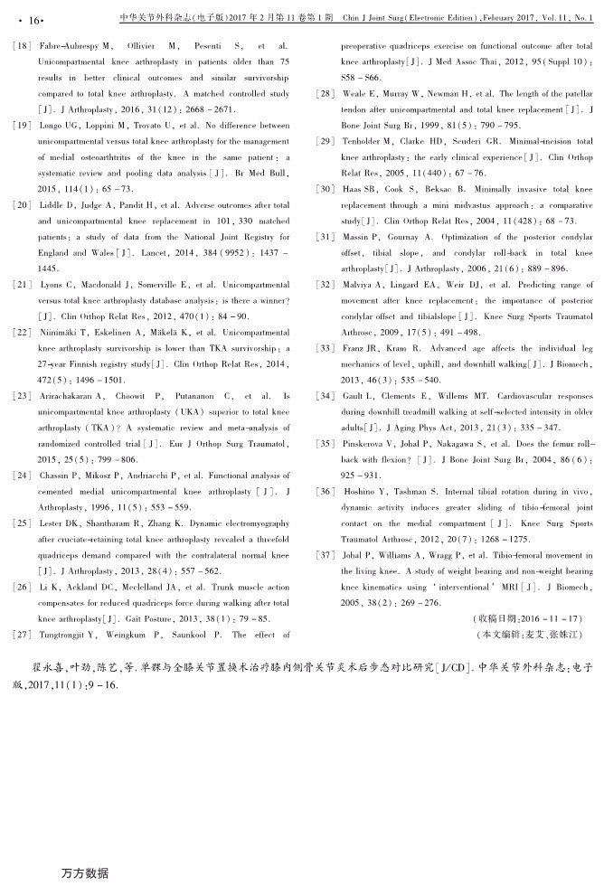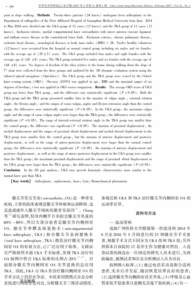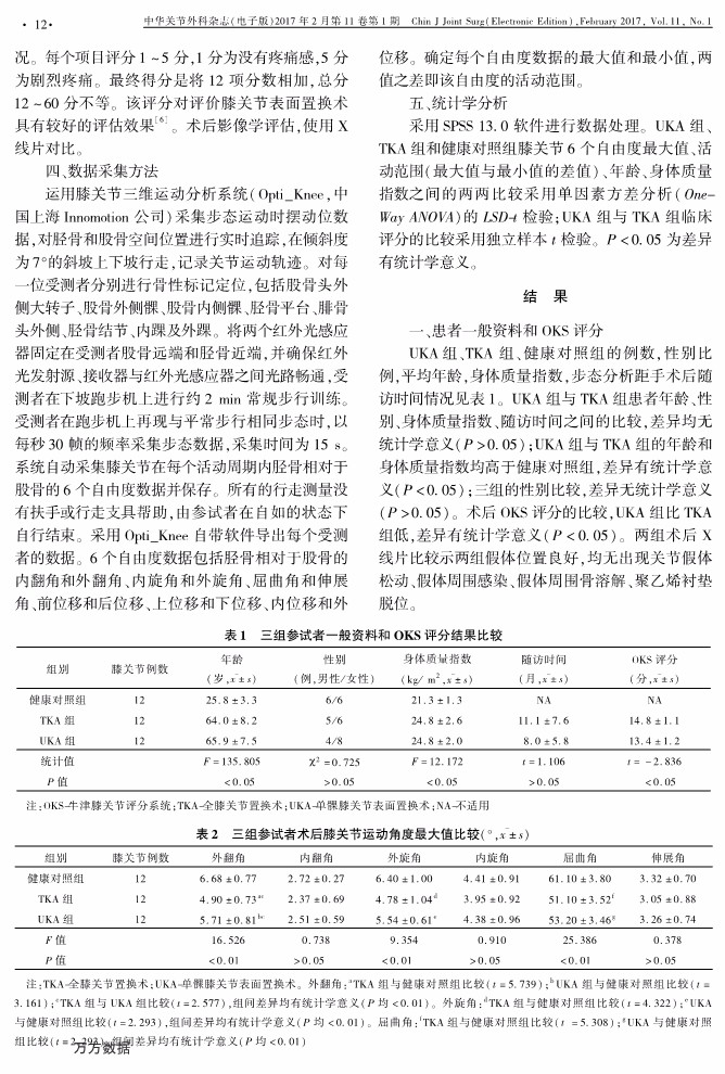 单髁与全膝关节置换术治疗膝内侧 骨关节炎术后步态对比研究