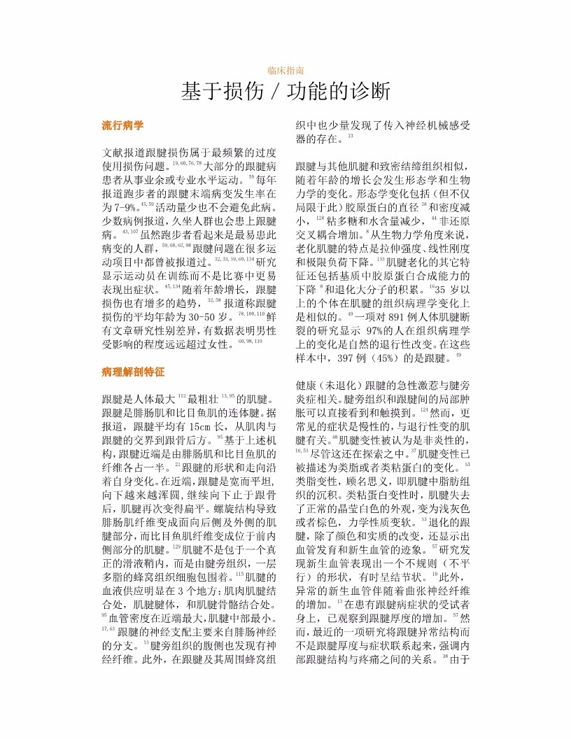 本篇指南是“美国物理治疗协会骨科分会功能、残疾和健康国际分类相关临床实践指南”的组成部分。据文献报道,跟腱损伤属于发病频率较高的人体过度使用性损伤。大部分的跟腱病患者经常从事业余或专业体育运动。在美国,每年跑步者的跟腱末端病变发生率在7-9%,跑步者是最易患此病变的人群。随着年龄增长,跟腱损伤也有发病增多的趋势,跟腱损伤患者的平均年龄为 30-50 岁,有数据表明男性受此病变影响的程度超过女性。美国学者制定本临床指南的目的是:对于此类损伤人群,为骨科物理治疗师、临床医生等相关人员提供最好的,经过循征医学证据支持的治疗干预手段,确定适合患者的疗效检测方法,评估物理治疗干预手段的效果。